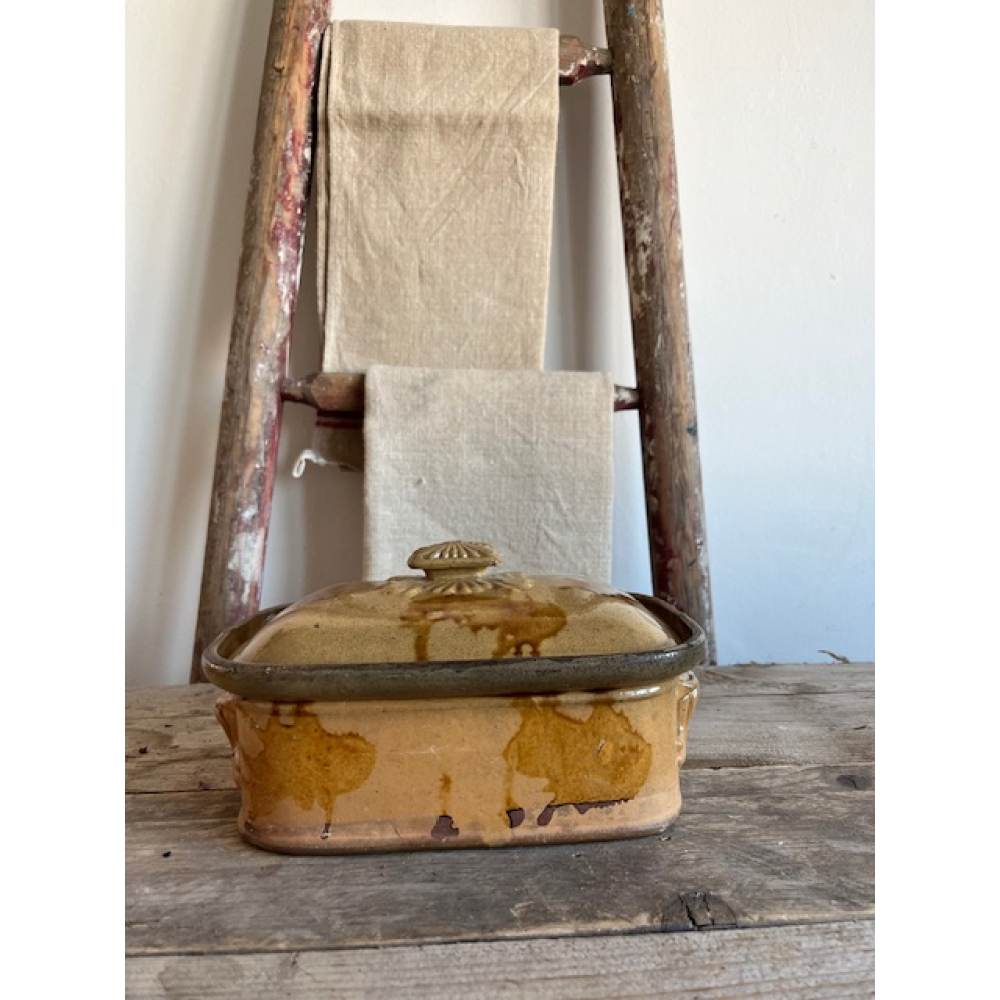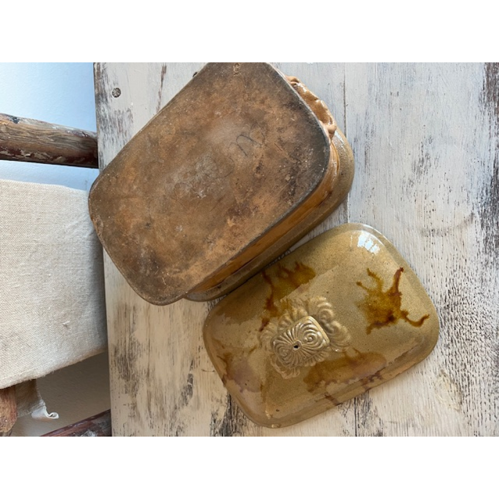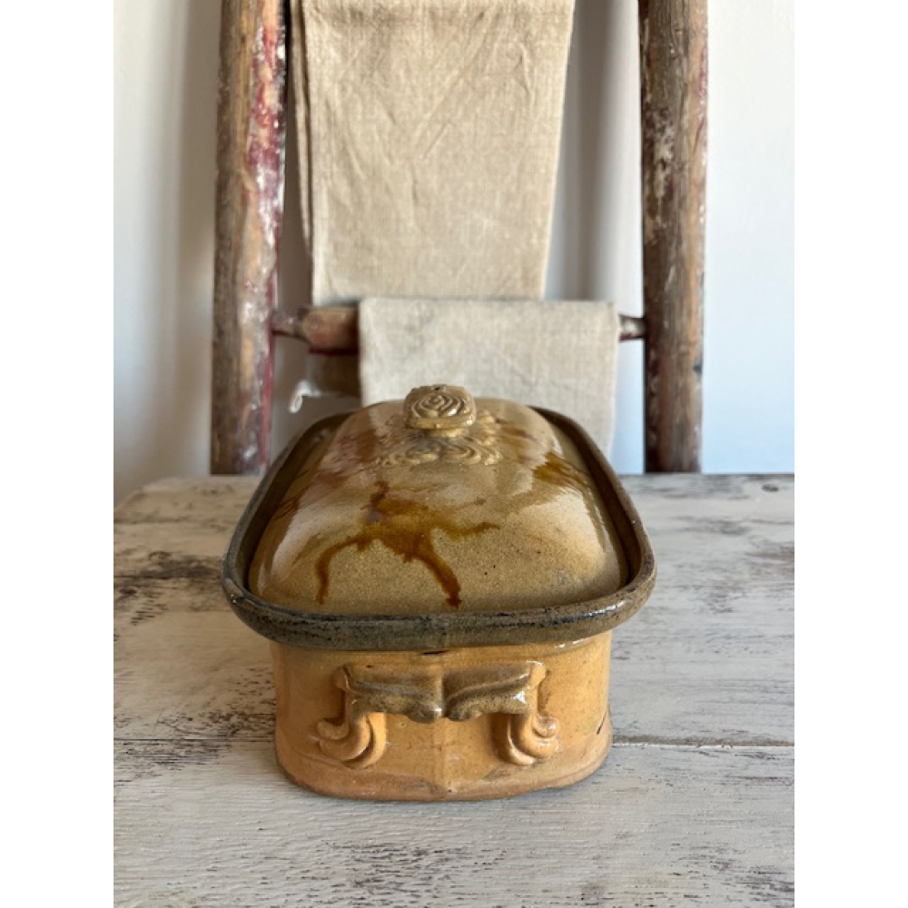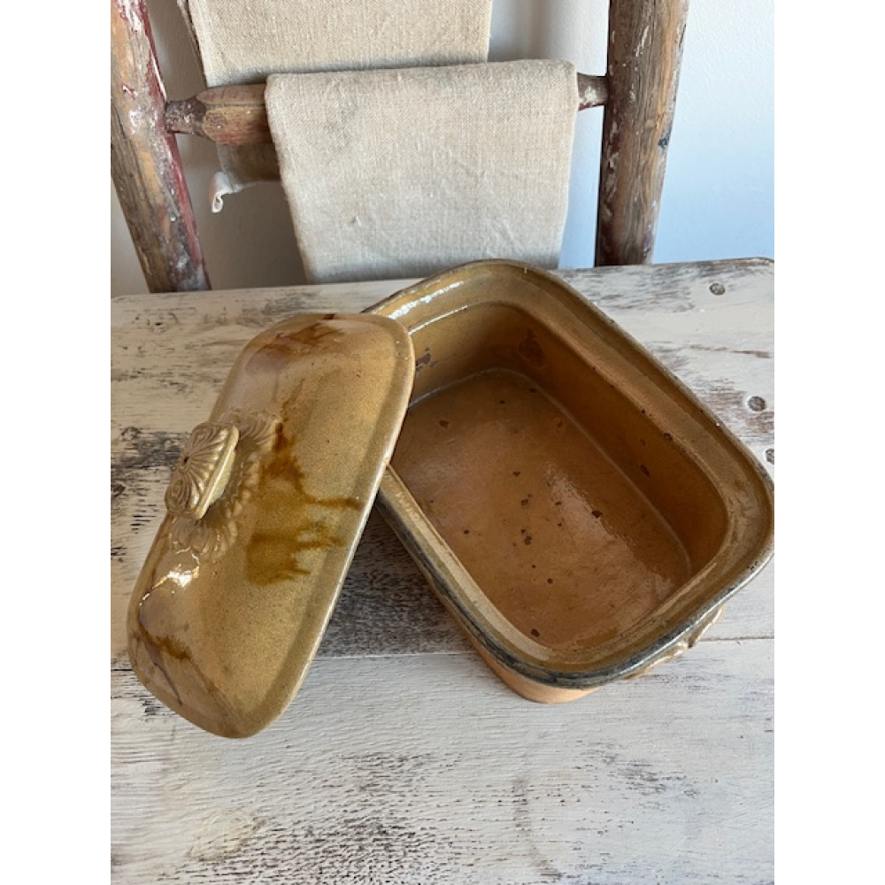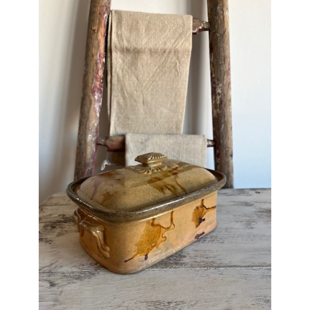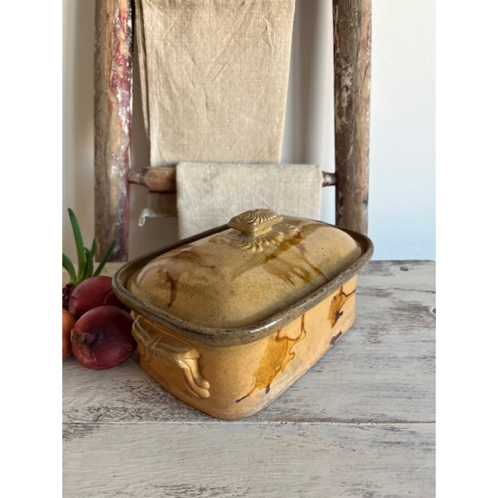 Authentieke antieke Franse patéterrine van terracotta met geglazuurde afwerking. Deze ambachtelijke aardewerken schaal met deksel werd traditioneel gebruikt voor het bereiden en serveren van paté en andere vleesgerechten.