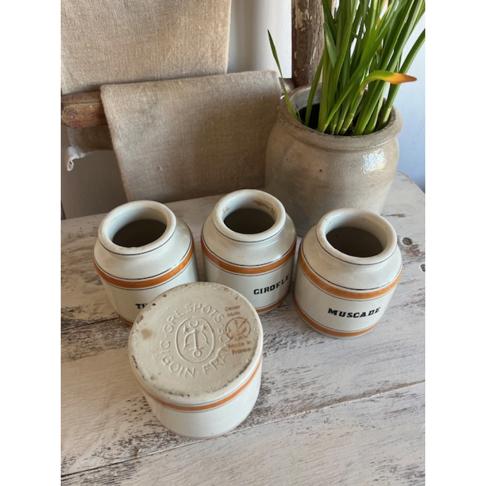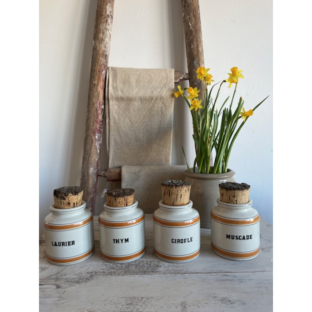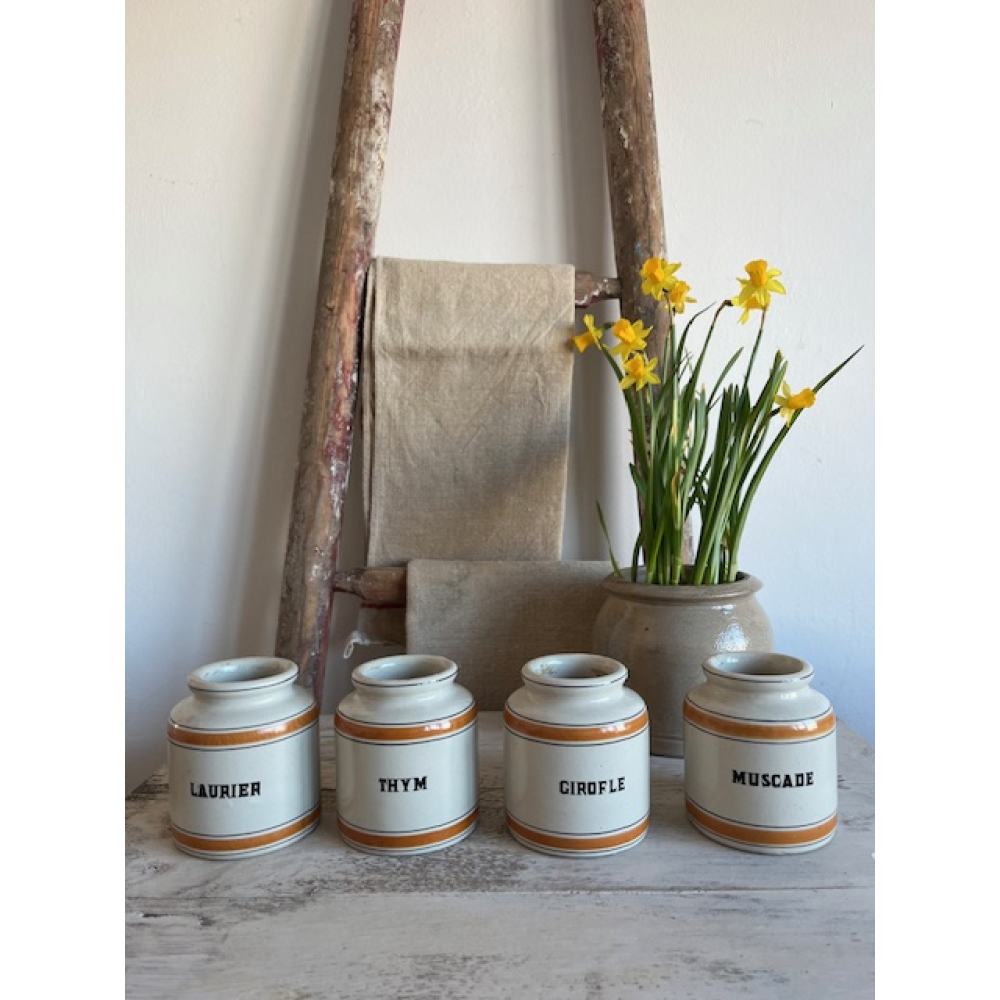Set van vier vintage Franse kruidenpotten van geglazuurd aardewerk, uit de jaren 50. De potten zijn gemerkt met Laurier (laurier), Thym (tijm), Girofle (kruidnagel) en Muscade (nootmuskaat).