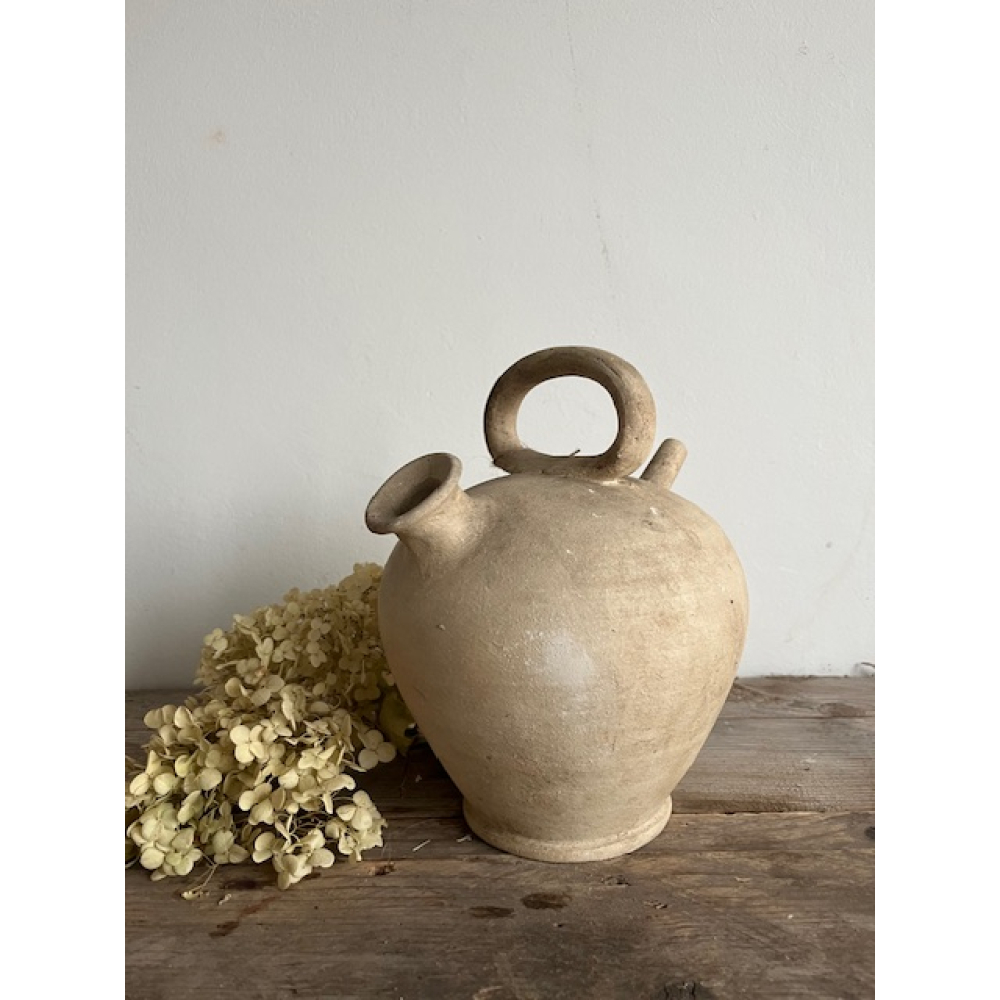 Prachtig oud Frans waterkruikje van aardewerk. Vroeger werd dit type kruik gebruikt op het veld. Dit exemplaar is een echte zomerkruik, ongeglazuurd, zodat de inhoud op natuurlijke wijze koel bleef.