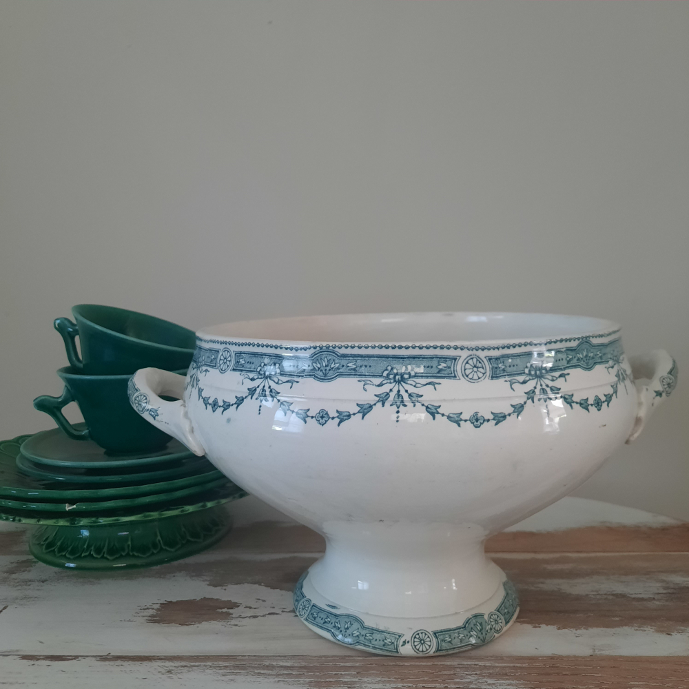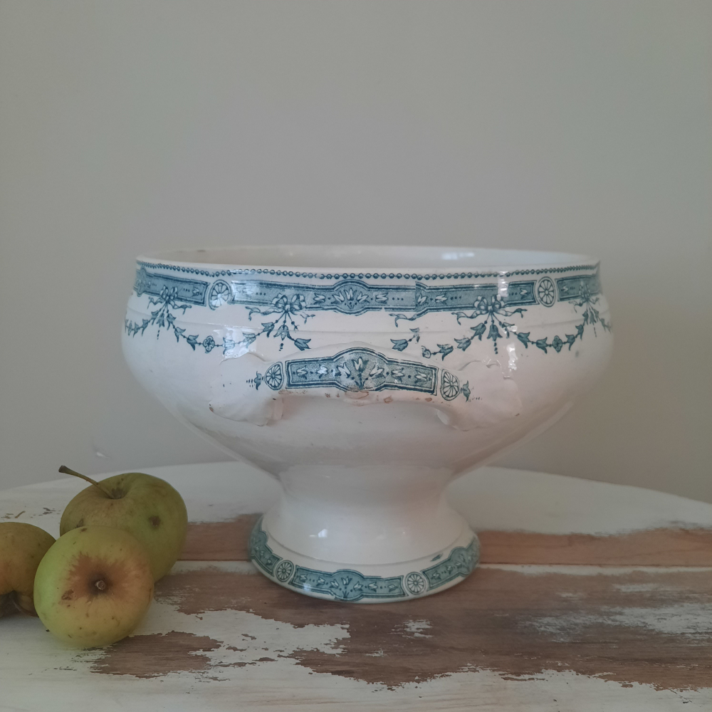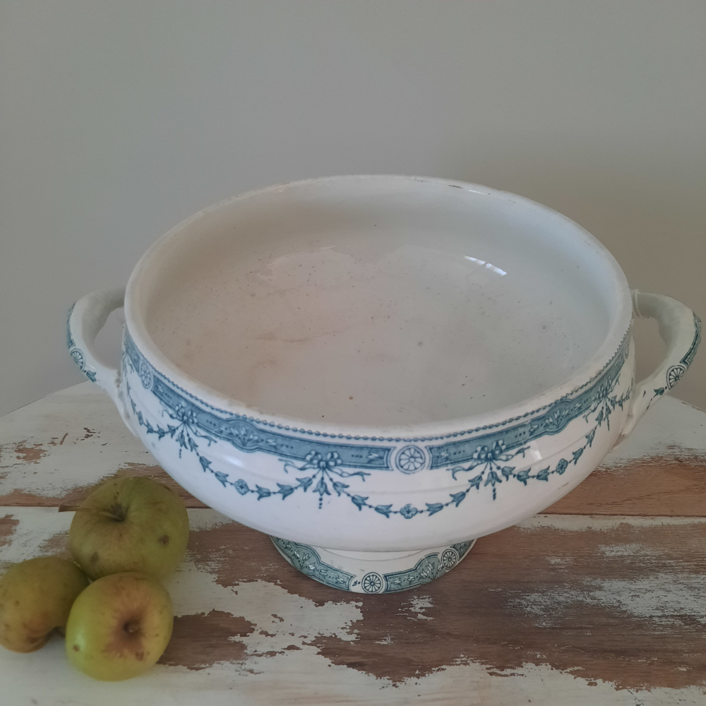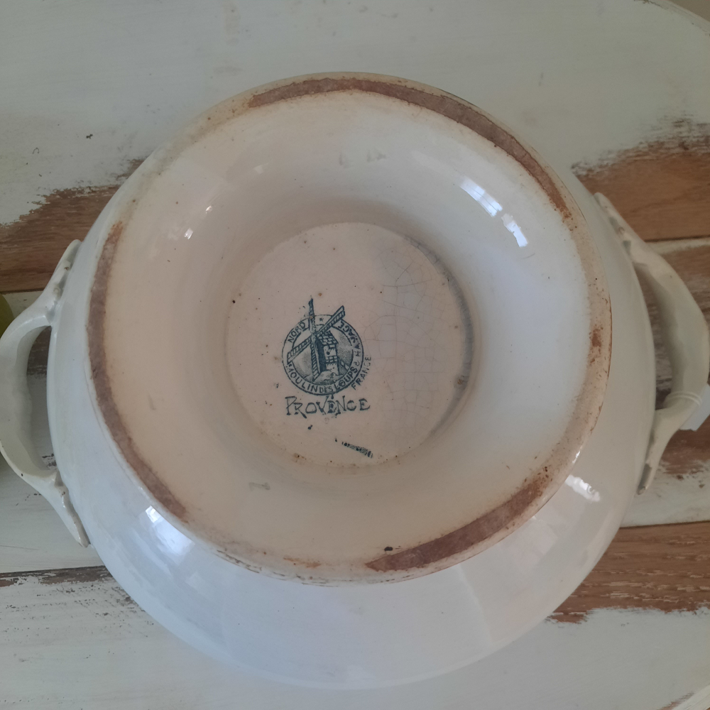 Prachtige oude Franse soep terrine, mooi detaile is het decor op de handgrepen.