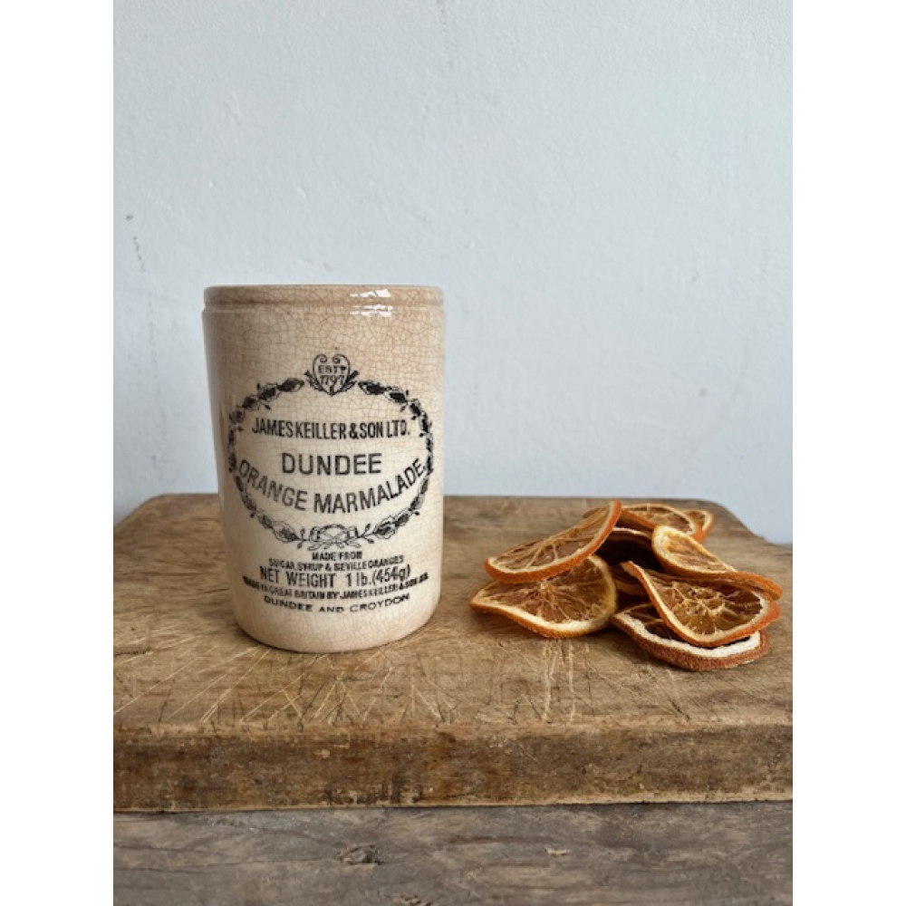 Originele ironstone marmeladepot van de beroemde Dundee Orange Marmalade. Voorzien van klassieke zwarte transferdruk met vermelding van Dundee en Croydon. Deze keramische potten werden gebruikt voor export voordat glazen potten de standaard werden. Mooi doorleefd patina passend bij de leeftijd.
