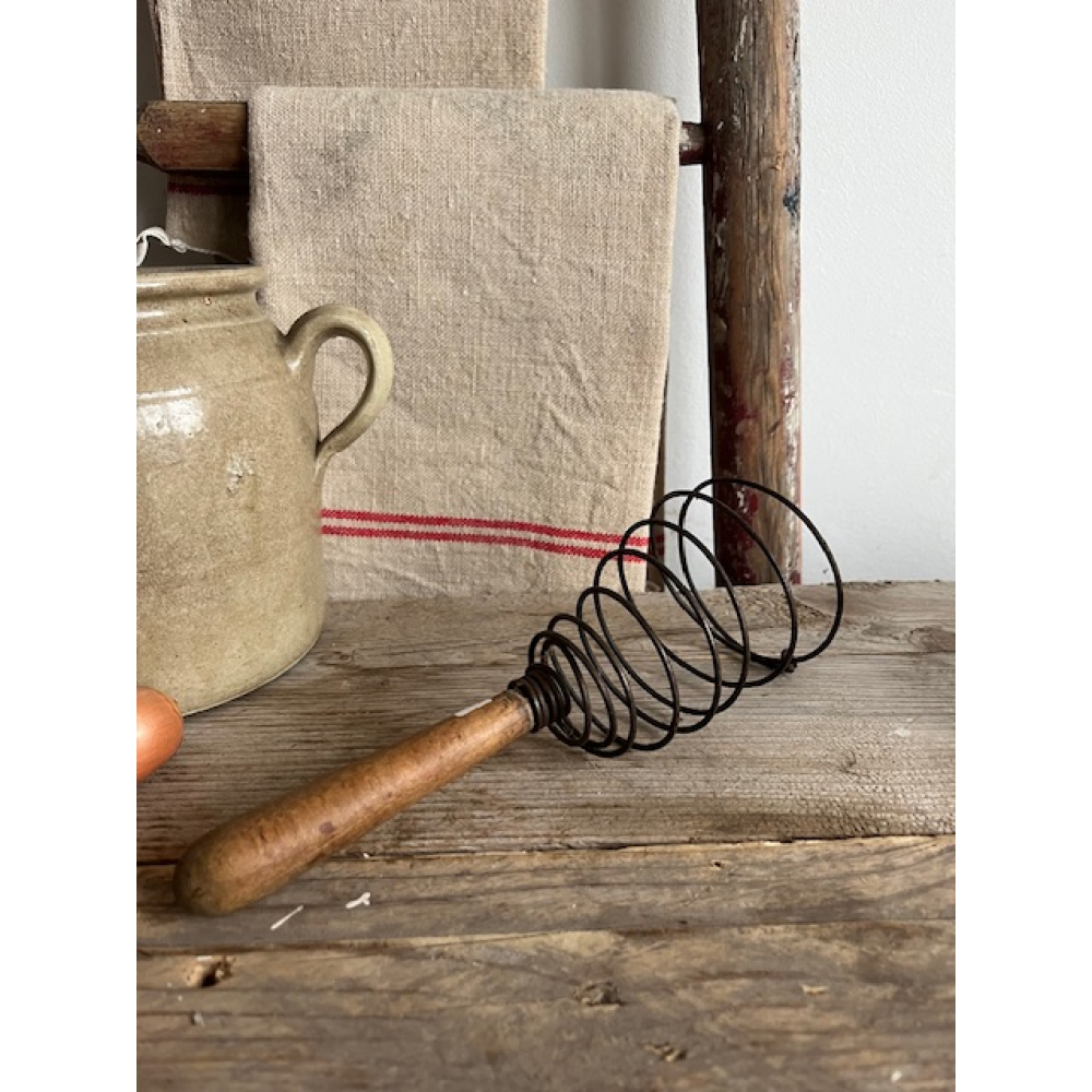 Het betreft een vintage Franse fouet à spirale, oorspronkelijk ontworpen om ingrediënten en vooral eieren te mengen in een kom.