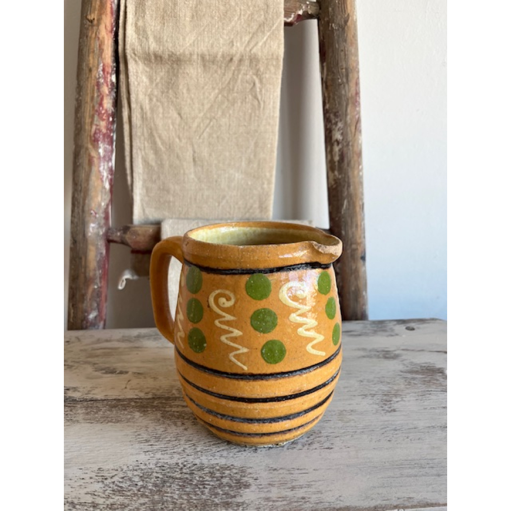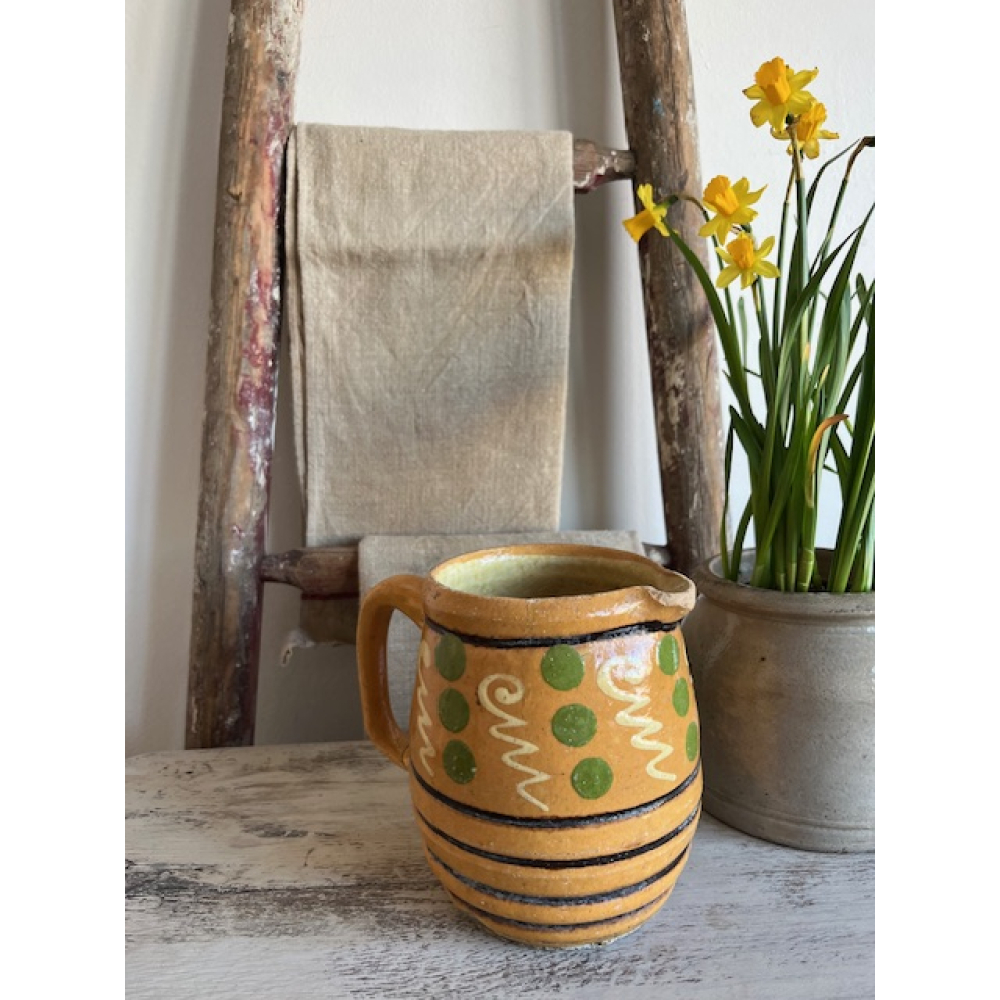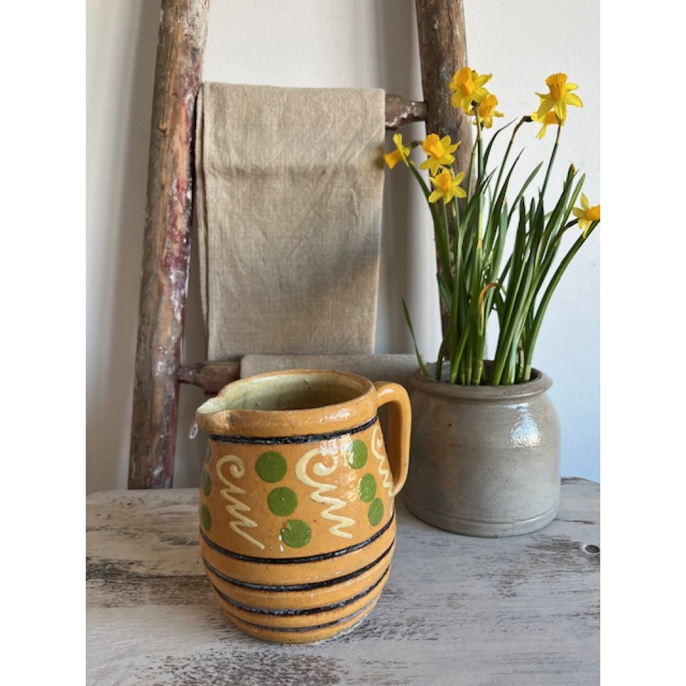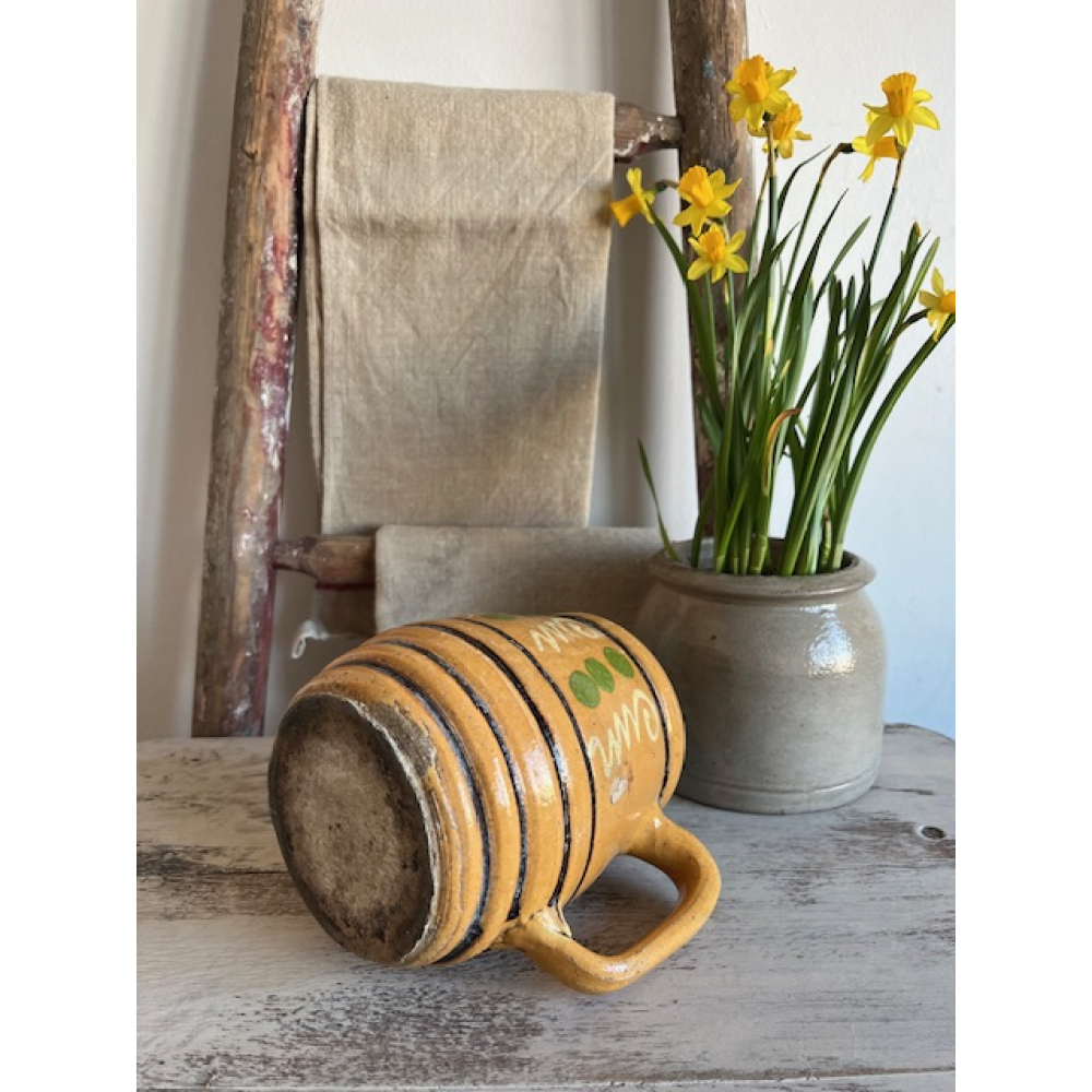 Authentieke antieke kan uit de Elzas, vervaardigd uit geglazuurd aardewerk en met de hand beschilderd met een motief in warme tinten. Een prachtig voorbeeld van traditioneel Country French vakmanschap.